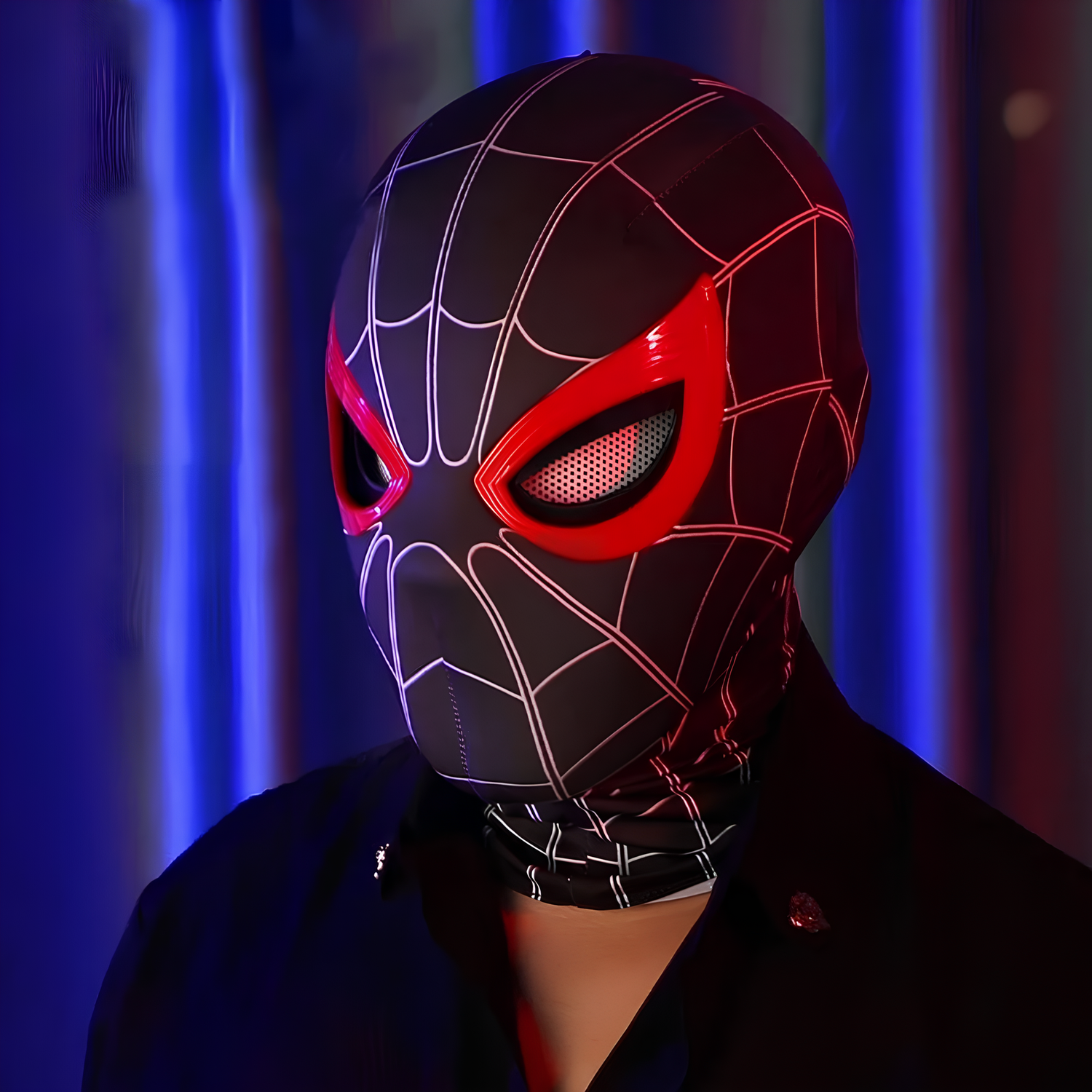 Le Masque Spiderman inspiré de Miles Morales intègre un système innovant pour simuler les clignements et les expressions de Spiderman, rendant le masque vivant et interactif.